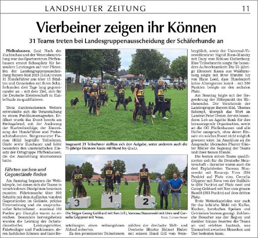 Vom 25. bis 27. Juli fand in Pfeffenhausen die Landesgruppenausscheidung statt. Hier qualifizierten sich die besten 7 Mensch-Hund Teams für die Bundessiegerprüfung, die dann von 12. bis 14. September in Halle an der Saale stattfindet.