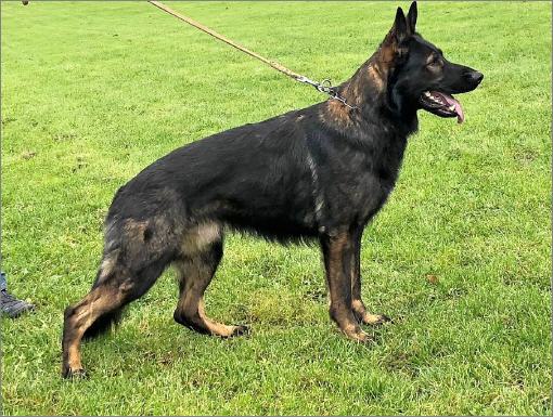 Groß, mittelkräftig, guter Ausdruck, guter Widerrist, gerader Rücken, Kruppe etwas kurz, abschüssig, gute Vor-, sehr gute Hinterhandwinkelung, korrekte Front, gute Vorbrust, Unterbrust sollte länger sein. Hinten und vorne gerade gehend, sehr gute Schrittweite mit sehr wirksamem Nachschub und gutem Vortritt. Sicheres Wesen, TSB ausgeprägt.